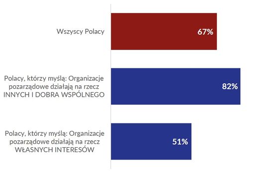 44% Polaków uważa, że organizacja pozarządowe działają na rzecz innych i dobra wspólnego, zaś 19% procent skłania się raczej ku opinii, że ich aktywność służy realizacji własnych interesów.