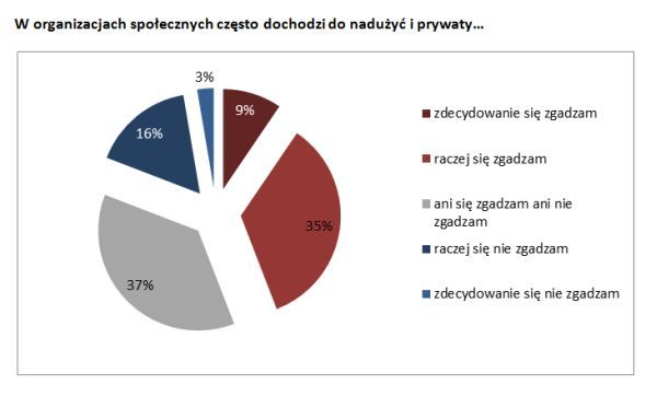 Od kilku lat z przekonaniem, że w organizacjach często dochodzi do nadużyć i prywaty zgadza się niemal 50% badanych. Odsetek ten pozostaje na niemal niezmienionym poziomie od 2007 roku. Jest to zatem całkiem liczna grupa (tylko 19% Polaków twierdzi odwrotnie).