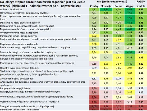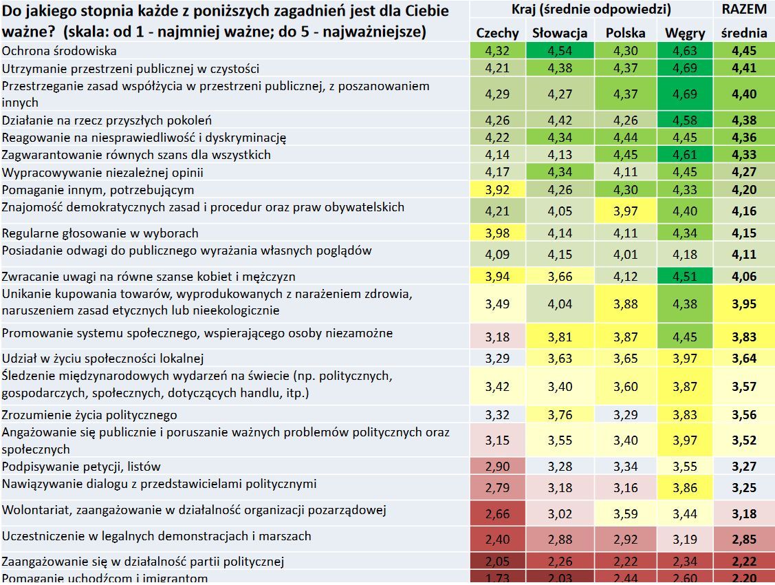 W dwóch pierwszych krajach kwestie wspierania imigrantów i uchodźców są postrzegane jako najmniej istotne ze wszystkich 24 ocenianych zagadnień, z kolei w Polsce i na Węgrzech jako jeszcze mniej ważne postrzegane jest „angażowanie się w działalność partii politycznej”. W Czechach i na Słowacji wstępowanie do partii politycznych też nie cieszy się poparciem i zajmuje pozycję drugą od końca.