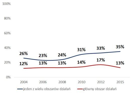 Jednocześnie, sukcesywnie wzrasta odsetek organizacji, które działalność kulturalną traktują jako jeden z wielu obszarów swojej aktywności. W 2015 roku 35% organizacji podało, że „kultura i sztuka” jest dla nich ważnym obszarem działań. Pamiętając o tym, że dla 13% stowarzyszeń i fundacji działalność kulturalna jest wiodąca, zauważamy, że pozostaje 22% organizacji, które ten obszar traktują jako dodatkowy.