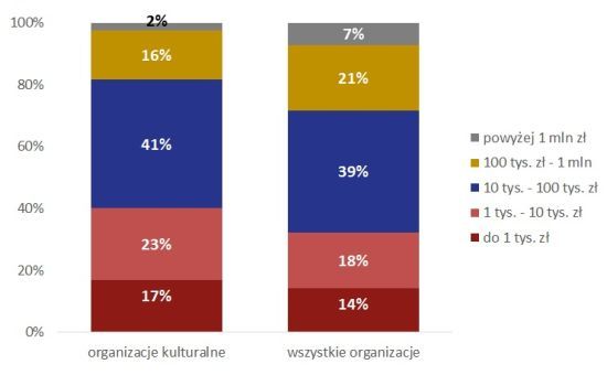 Organizacje kulturalne stanowią najbiedniejszą część polskiego sektora pozarządowego. Budżet przeciętnej organizacji pozarządowej w Polsce wyniósł w 2014 roku 27 tysięcy złotych. Organizacje kulturalne dysponowały wówczas kwotą o wiele mniejszą – 18 tysiącami złotych rocznie, a organizacje z najzasobniejszej branży usług socjalnych i pomocy społecznej – 73 tysiącami. Oznacza to, że przeciętna organizacja z branży o największych przychodach miała czterokrotnie większy budżet niż przeciętna organizacja reprezentująca branżę kultury i sztuki.