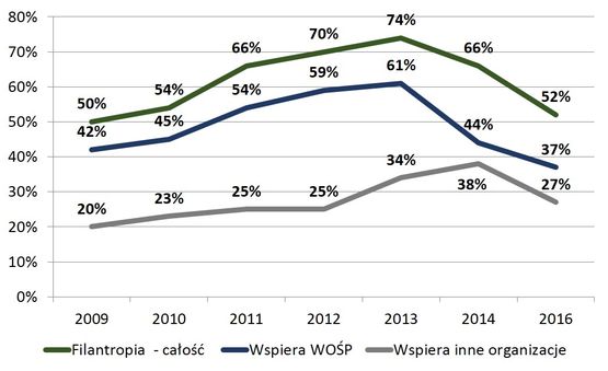 Kiedy procent Polaków wspierających finansowo organizacje w 2016 roku porównać z danymi z poprzednich lat, okaże się, że o ile do roku 2013 deklarowane zaangażowanie filantropijne rosło (osiągając w maksymalny poziom 74%), to od trzech lat notuje spadki. Dotyczy to zarówno wsparcia dla WOŚP, jak i pozostałych organizacji.