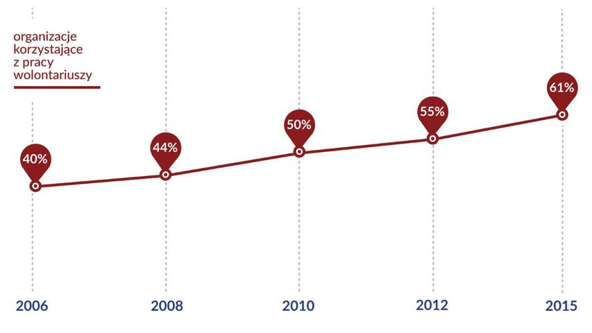 Jeszcze 5 lat temu z pracy wolontariuszy korzystała dokładnie połowa NGO, dziś współpracuje z nimi już 61% stowarzyszeń i fundacji. Organizacje angażujące do swoich działań wolontariuszy współpracują przeciętnie z 10 osobami rocznie. 5 spośród nich to osoby ściśle współpracujące z organizacją, czyli angażujące się często i regularnie, przynajmniej raz w miesiącu.
