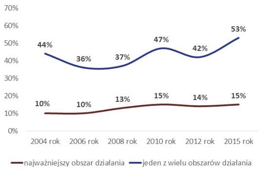 Choć odsetek organizacji, dla których edukacja i wychowanie jest najważniejszym obszarem aktywności (które będziemy nazywać „edukacyjnymi”), utrzymuje się od kilku lat na podobnym poziomie, to przybywa organizacji, które zajmują się tą tematyką dodatkowo (za najważniejszy obszar działania uznając inne dziedziny).