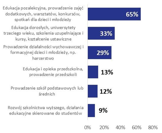Jakie więc działania podejmują organizacje edukacyjne? Dwie trzecie (65%) z nich zajmuje się edukacją pozalekcyjną, prowadzeniem zajęć dodatkowych, warsztatów czy konkursów właśnie dla dzieci i młodzieży, a 29% prowadzi skierowaną do nich działalność wychowawczą (np. harcerstwo). Dodatkowo 13% zajmuje się edukacją i opieką przedszkolną, a 12% prowadzi szkoły podstawowe i średnie.
