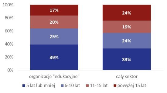 Wśród organizacji edukacyjnych stosunkowo dużo jest fundacji. To 24% z nich, podczas gdy w całym sektorze odsetek fundacji wynosi 17%. Pośrednio jest to związane ze stażem działania organizacji edukacyjnych. W ostatnich latach powstaje coraz więcej nowych fundacji, podczas gdy dynamika przyrostu stowarzyszeń jest coraz wolniejsza. Dlatego im „młodsza” branża sektora pozarządowego, tym większy w niej udział fundacji, a mniejszy stowarzyszeń. Tymczasem organizacje edukacyjne na tle całego sektora są dość młode. Niemal dwie trzecie (64%) z nich działa nie dłużej niż 10 lat (w całym sektorze 57%); prawie dwie piąte (39%) ma staż działania nie dłuższy niż 5 lat (w całym sektorze 33%).