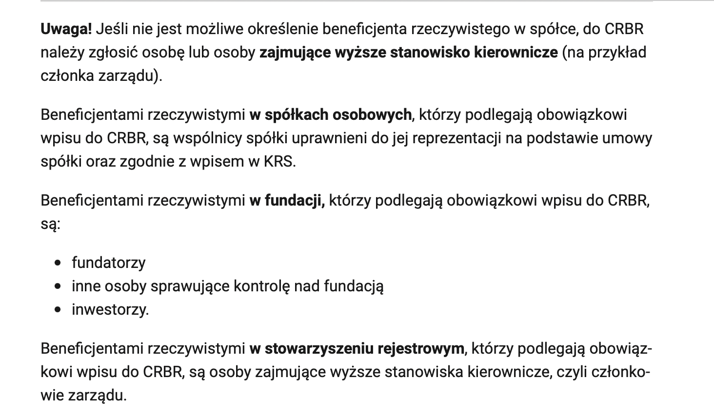 Inaczej rzecz się ma z fundacjami, bowiem jedynym obowiązkowym organem statutowym jest w nich zarząd, a fundator – organ stanowiący – może poza samym ustanowieniem fundacji nie posiadać żadnych kompetencji i uprawnień w już założonej fundacji. W zależności zatem od zapisów statutowych, w fundacji beneficjentem rzeczywistym mógł być fundator, członkowie rady fundacji, członkowie zarządu fundacji – w różnych kombinacjach, w zależności od tego, jakie kompetencje przyznawał im statut i ilu członków liczy organ stanowiący. Na rządowej stronie www.biznes.gov.pl obowiązki fundacji dotyczące zgłaszania beneficjenta rzeczywistego są opisane następująco.