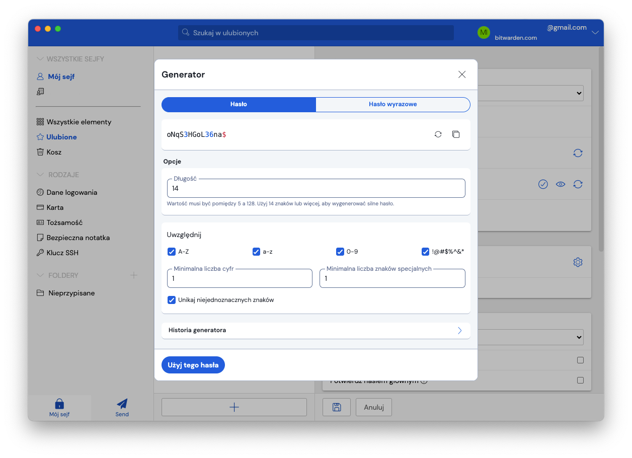 Dodawanie haseł do sejfu jest intuicyjne – wystarczy wpisać nazwę konta (np. Gmail), adres e-mail oraz wygenerować silne hasło (złożone z małych i wielkich liter, cyfr i znaków specjalnych). Hasło dostępu do samego sejfu musimy zapamiętać! Dobry sejf nie powinien przechowywać naszego hasła głównego (dzięki czemu takie hasło nie wycieknie). Zapamiętanie hasła jest kluczowe, ponieważ nie będzie możliwości jego resetu, jeżeli je zapomnimy.