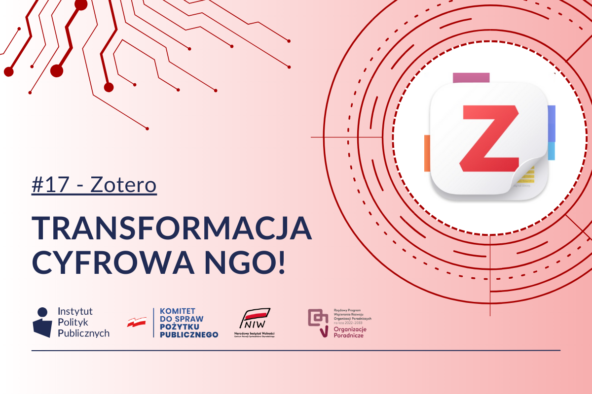 Zotero (https://www.zotero.org) to darmowe i otwarte oprogramowanie, które umożliwia organizowanie, cytowanie i współdzielenie materiałów badawczych. Dzięki jego funkcjonalnościom organizacje pozarządowe mogą efektywnie zarządzać dokumentacją, prowadzić badania oraz tworzyć raporty i publikacje.