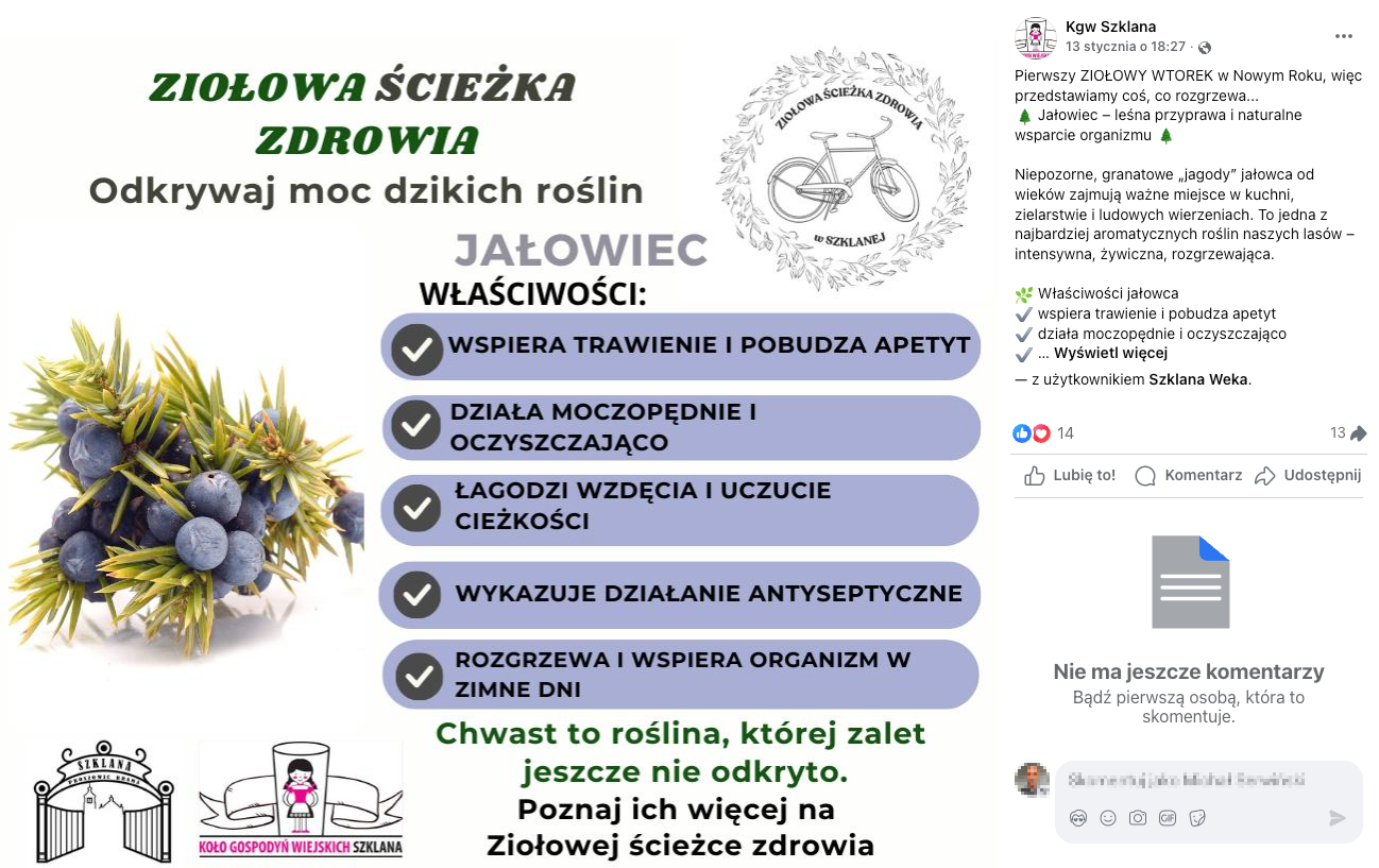 KGW Szklana publikuje cykl postów „Ziołowa ścieżka zdrowia” i co wtorek publikuje grafikę z opisem właściwości danej rośliny i przykładowymi przepisami. Uwzględnia przy tym aktualną porę roku, stąd w ostatnich tygodniach mogliśmy poczytać o cynamonie, anyżu, goździkach. Koło Gospodyń i Gospodarzy Wiejskich w Żarnowicy zamieściło serię postów o bioróżnorodności. Spójność i jakość są ważniejsze niż ilość.