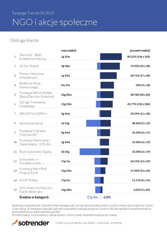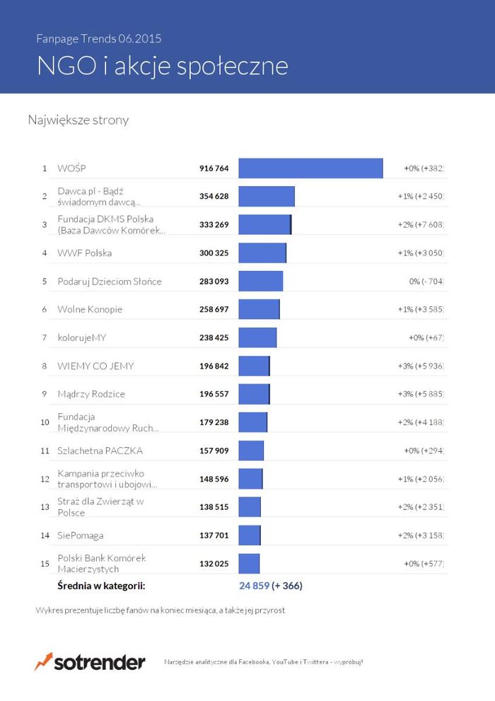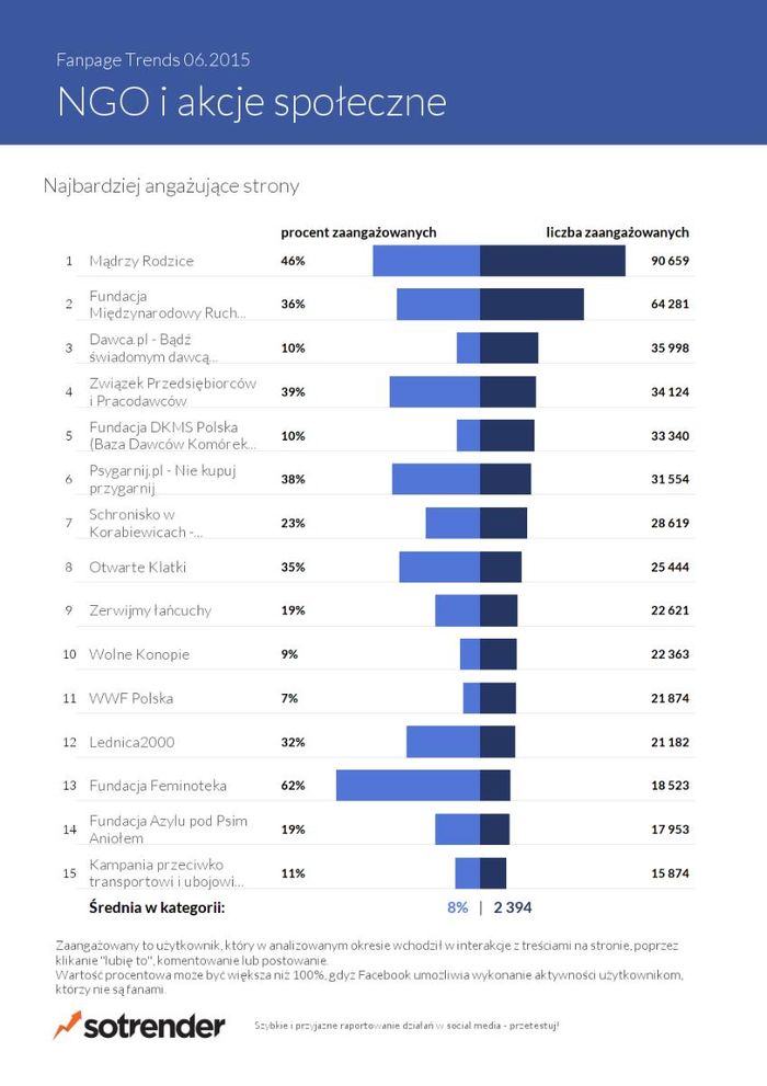 W kategorii NGO w zestawieniu Fanpage Trends firmy Sotrender w czerwcu pojawiła się nowa fundacja. I na dobrą sprawę to jedyne wydarzenie szczególnie warte wyróżnienia w tym miesiącu. Autorzy profilu „Wiemy, co jemy” zgłosili ją do cyklicznych raportów, toteż organizacja zadebiutowała na 9. miejscu. Jednocześnie jednak, fanpage ten ma drugi największy przyrost spośród wszystkich największych profili notowanych w zestawieniu. To też jest to ciekawostka socjologiczna, wybitnie dowodząca zainteresowania Polaków tematyką zdrowego odżywiania i jednocześnie kolejny bodziec dla twórców, którzy swoimi treściami mogą bez kompleksów konkurować z mnóstwem kanałów o tematyce zwierzęcej.