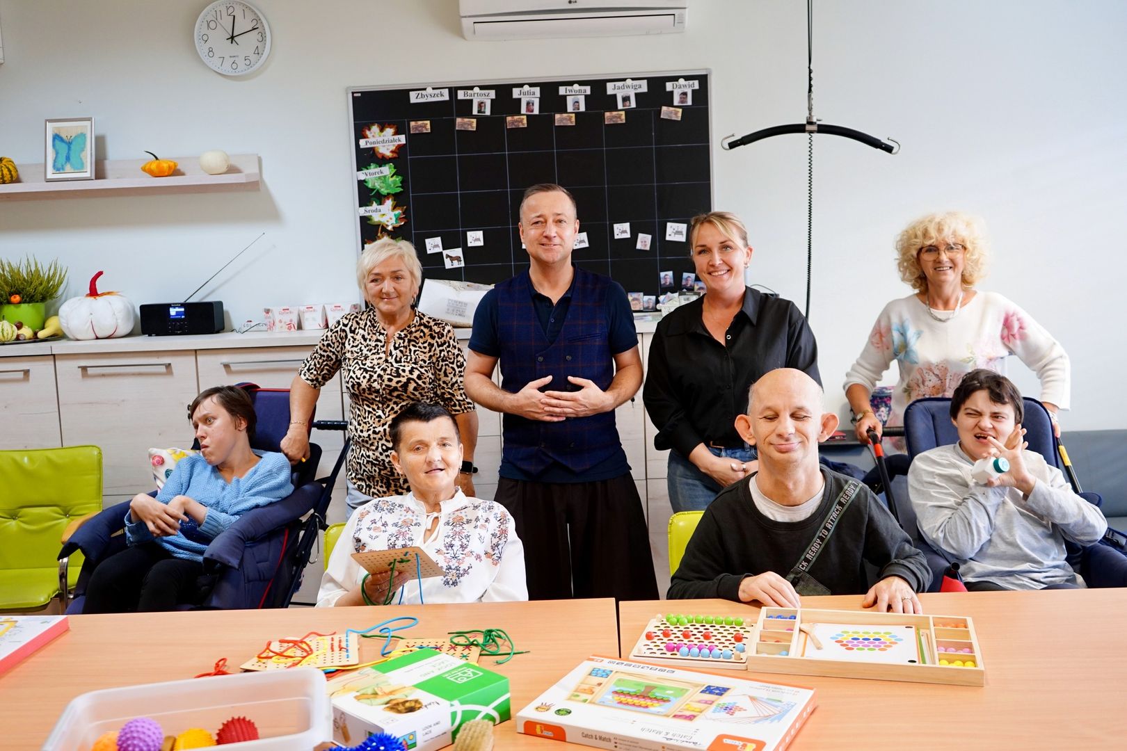 W drugiej części wizyty artysta udał się do Krośnic, gdzie Stowarzyszenie niedawno zakończyło remont nowego budynku. Mieści się tam Uniwersytet Dorosłości, Mieszkalnictwo Treningowe oraz Pokoje Wytchnień – miejsca, które stanowią ważny element systemu wsparcia osób z niepełnosprawnościami tworzonego przez MSPDiON.