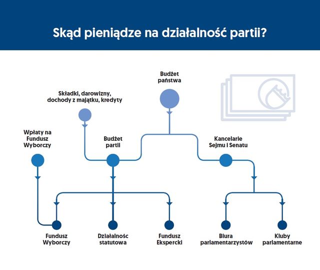 W raporcie - po raz pierwszy - pokazano różne strumienie publicznych pieniędzy, które płyną na działalność partii. Nie tylko subwencje na działalność statutową dla każdego ugrupowania, które w wyborach przekroczy próg 3%, nie tylko dotacje, czyli refundacje kosztów kampanii dla partii, którym się udało wejść do Sejmu i Senatu, ale także środki, które formalnie nie przepływają przez partyjne konta, ale wspierają działania partii politycznych w terenie, przeznaczone na funkcjonowanie biur poselskich i senatorskich. Oprócz pieniędzy z budżetu państwa, który jest podstawowym źródłem dochodów dla partii, pozyskują one również środki z innych źródeł. Są to indywidualne wpłaty, darowizny i składki członkowskie.