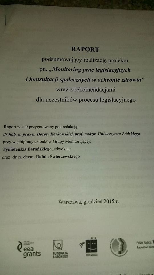 Głównym rezultatem szesnastu miesięcy trwania projektu realizowanego przez Instytut Praw Pacjenta i Edukacji Zdrowotnej pn. „Monitoring prac legislacyjnych i konsultacji społecznych w ochronie zdrowia” jest raport podsumowujący projekt wraz z rekomendacjami dla uczestników procesu legislacyjnego. Raport został przygotowany pod redakcją dr hab. n. prawn. Doroty Karkowskiej, prof. nadzw. Uniwersytetu Łódzkiego przy współpracy członków Grupy Monitorującej: Tymoteusza Barańskiego, adwokata oraz dr n. chem. Rafała Świerzewskiego.
