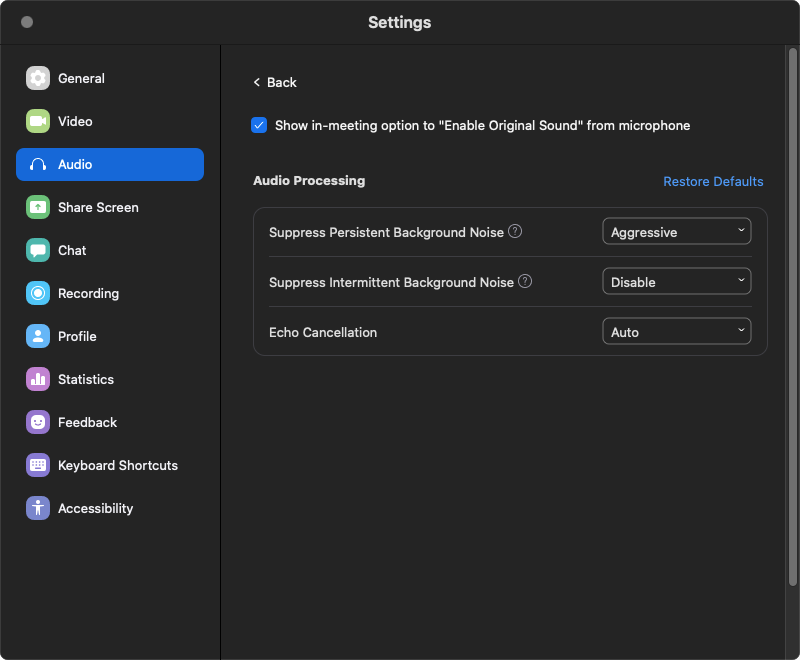 Posłużę się tutaj przykładem aplikacji Zoom, z której sam najczęściej korzystam. Wchodząc w ustawienia audio, można znaleźć tam odnośnik do zaawansowanych opcji (Settings > Audio > Advanced). Znajdziesz tam między innymi: