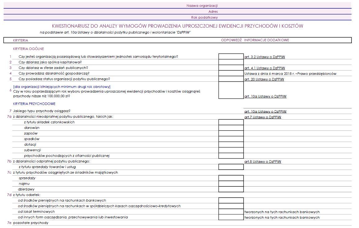Jeżeli rozważasz prowadzenie uproszczonej ewidencji, musisz sobie zadać kilka pytań. Przykładowe znajdziesz poniżej. Pełny kwestionariusz do analizy możesz pobrać pod artykułem. Po więcej informacji na temat rachunkowości organizacji pozarządowych. w tym interaktywny kwestionariusz w EXCEL zajrzyj na https://sprawozdaniefinansowe.eu/narzedzie-ngo/