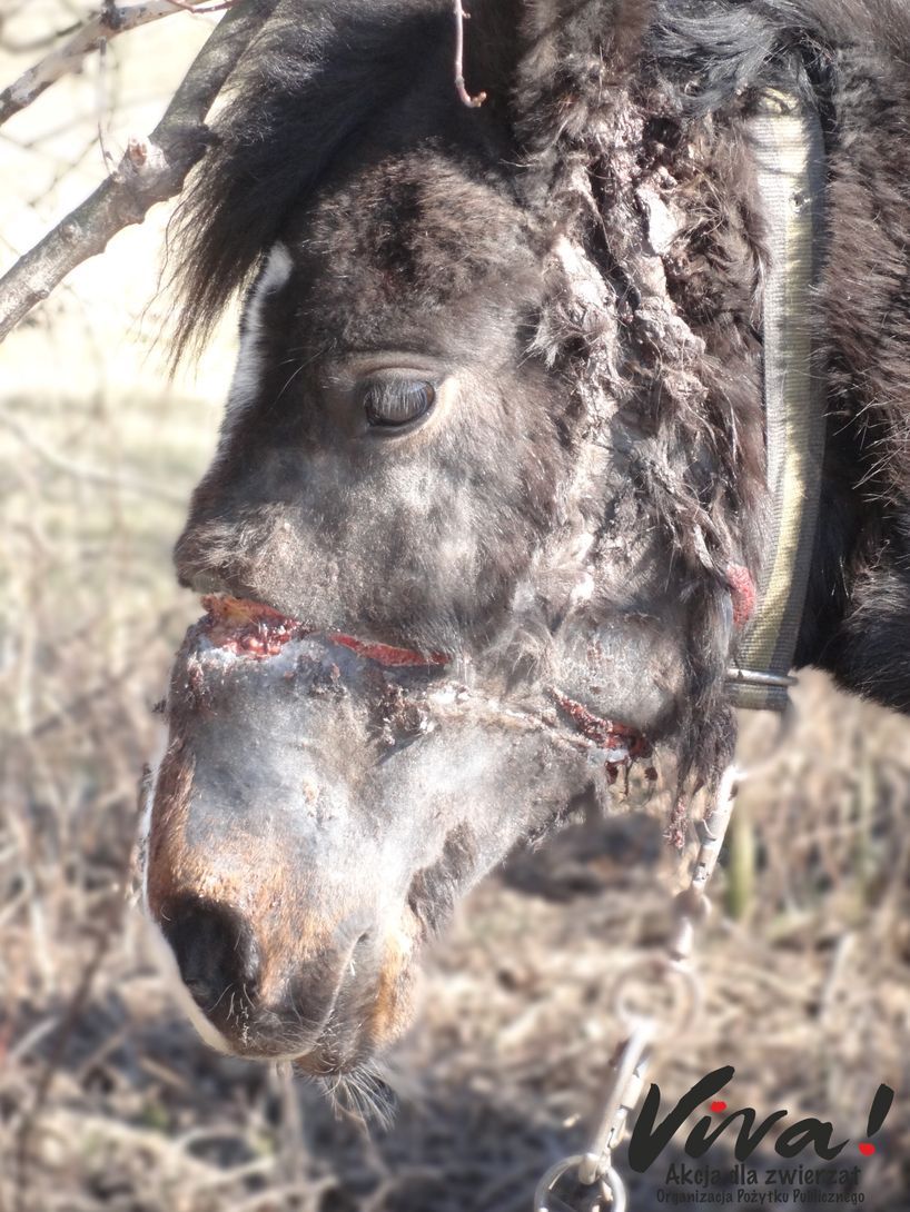 Sąsiedzi szukają pomocy w Fundacji Viva!, której przedstawiciele zjawiają się nazajutrz po otrzymaniu alarmującego zgłoszenia. W interwencji bierze również udział powiatowy lekarz weterynarii. Rana na głowie zwierzęcia jest ogromna i ropiejąca, a fetor wydobywający się z niej trudny do wytrzymania. Sam koń jest również wychudzony, a z bólu nie daje się opatrzyć ani nawet dotknąć. Konieczna jest pomoc lekarza ze środkami usypiającymi. Koń zostaje odebrany właścicielowi i przewieziony na leczenie do specjalistycznej kliniki. W szczegółowych badaniach okazuje się, że cierpienie tego zwierzęcia to nie tylko rozległe zewnętrzne obrażenia, ale także deformacje kości czaszki, spowodowane długotrwałym uciskiem kantara. Zwierzę miało utrudnione oddychanie i jedzenie, a gdyby ratunek nie nadszedł – zmarłoby albo z głodu albo z braku tlenu. Jeśli wcześniej nie zabiłaby go sama infekcja.