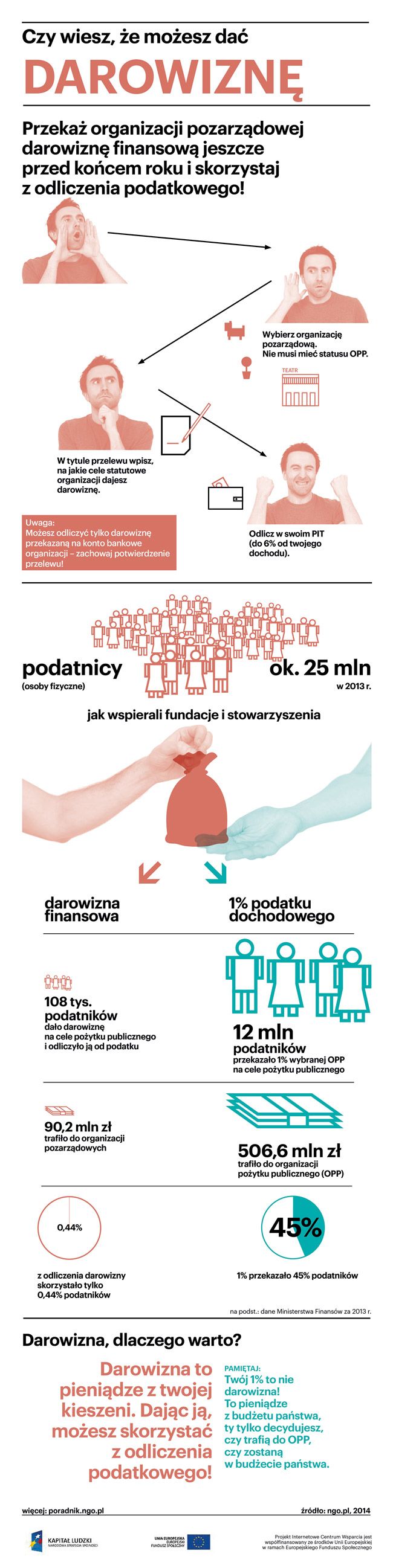 Liczby potwierdzają, że chętnie przekazujemy 1% (w 2013 r. – 45% podatników), a sporadycznie korzystamy z odliczenia podatkowego darowizny finansowej na cele pożytku publicznego – w 2013 r. zrobiło to tylko 0,44% podatników. To trochę tak, jakbyśmy zapomnieli, że darowizna i odliczenie są w ogóle możliwe. Szkoda, że tak mało podatników korzysta z tego uprawnienia i na pewno nie da się tego wytłumaczyć tylko tym, że nie każdego stać na to, żeby dać darowiznę z własnej kieszeni.