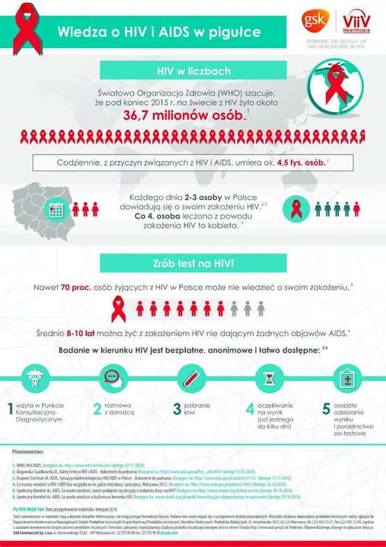 Warto podkreślić, że nadal nawet 70 proc. osób żyjących z HIV w Polsce może nie wiedzieć o swoim zakażeniu1. Co ciekawe, z zakażeniem HIV nie dającym objawów AIDS można żyć średnio 8-10 lat1. W tym czasie wirus stopniowo niszczy układ immunologiczny (odpornościowy) osoby dotkniętej zakażeniem, może powodować rozwój zespołu różnych infekcji i nowotworów (chorób wskaźnikowych AIDS)5,9.
