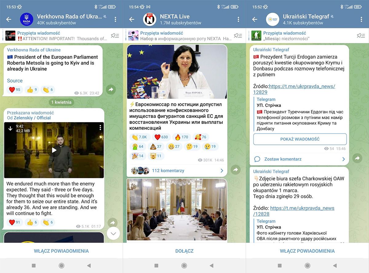 - Ukraiński Telegraf: kanał tworzony przez młodych dziennikarzy mieszkających w Polsce (Małankę, Ostapa, Zofię, Dmytra i Iren). Prezentuje przetłumaczone z języka ukraińskiego na polski informacje nt. wojny, które pojawiają się w ukraińskich kanałach telegramowych i mediach.
