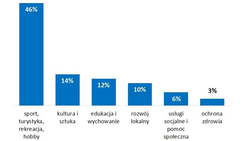 Niemal połowa (46%) organizacji pozarządowych działających na wsi i w najmniejszych miastach liczących nie więcej niż 20 tys. mieszkańców zajmuje się głównie sportem, turystyką, rekreacją i hobby. Dla porównania – w całej Polsce w tym obszarze specjalizuje się "tylko" 34% NGO. Drugą pod względem popularności branżą jest "kultura i sztuka", a trzecią "edukacja i wychowanie". Zajmuje się nimi odpowiednio 14% i 12% stowarzyszeń i fundacji ze wsi i najmniejszych miast.