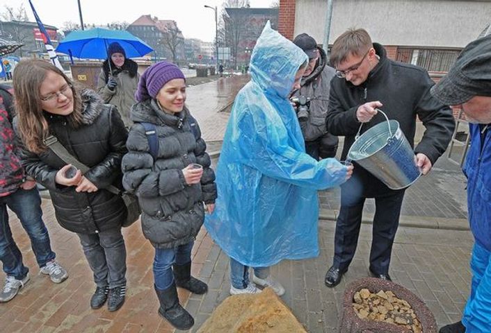 Uczestnicy happeningu w Katowicach zaopatrzeni w niebieskie kartki, elementy ubioru i parasole wzięli również udział w pamiątkowym zdjęciu ustawiając się w kształt kropli wody, sfotografowanej z góry.