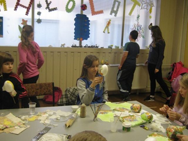 Podczas wykonywania ozdób nawiązywano również do tradycji Świąt Wielkanocnych poprzez odpowiedzi podopiecznych na krótkie pytania takie jak: Jak nazywa się środa, od której – wg tradycji-zaczynamy post?, Jak długo trwa post? Jak nazywała się potrawa, którą dawniej ludzie spożywali w okresie postu?, wymień 3 dowolne zwyczaje Wielkanocne, podaj nazwę tradycyjnego ciasta pieczonego tylko z okazji Świąt Wielkanocnych, jakie produkty zawiera koszyk za święconką?, w który dzień zjadamy produkty z koszyczka?, jak nazywają się jajka dekorowane różnymi wzorkami?