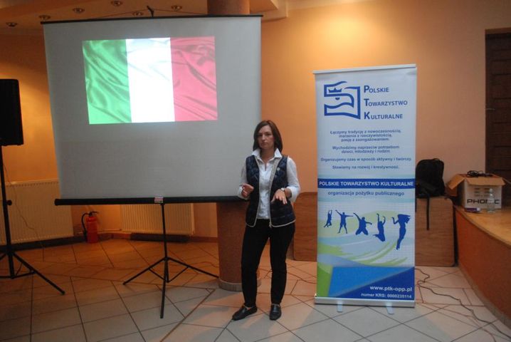 Już na samym początku uczestnicy spotkania zostali zaskoczeni powitaniem w melodyjnym włoskim języku. Prelegentka – Małgorzata Kołkowska spędziła rok, mieszkając i ucząc się włoskiego w stolicy słonecznej Italii. Nic dziwnego, że doskonale włada tym językiem.