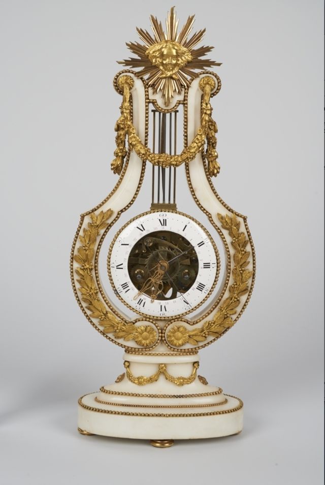 To cenne dzieło znajdzie godne miejsce w Apartamencie Królewskim. Zegar z główką Apollina, w kształcie liry, odmierza sekundy, minuty, godziny i dni miesiąca. Zegary w formie liry, będącej atrybutem Apollina (najczęściej zresztą zwieńczone jego głową) należą do grupy czasomierzy będących swoistą apoteozą tego boga, patronującego sztuce, która jako jedyna opiera się zwycięsko nawet działaniu niebłaganego czasu.