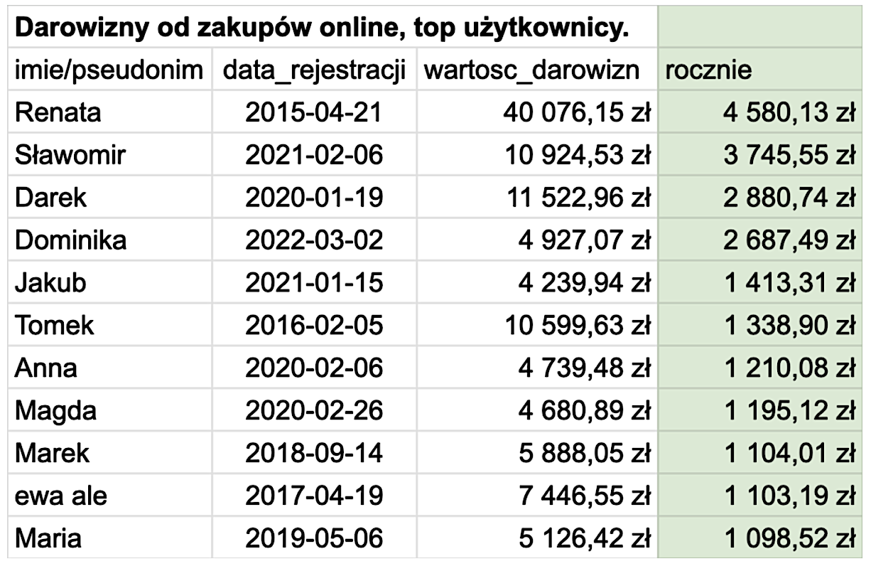 Regularne małe darowizny na przestrzeni czasu łączą się w całkiem pokaźne sumy — nawet kilka tysięcy złotych rocznie! Zobacz sam: oto darczyńcy, którzy za pośrednictwem FaniMani wygenerowali na wybrany przez siebie cel największe kwoty.