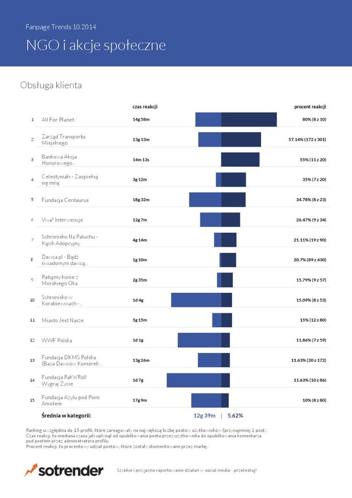 Począwszy od tego miesiąca Sotrender umieszcza w swoich zestawieniach specjalny ranking dotyczący „obsługi klienta”. Tak nazwana kategoria obrazuje dwie dane – średni czas reakcji danego fanpage'a na posty fanów, a także procent reakcji, jakie administratorzy podjęli. To wyjątkowo ciekawa dana, której analiza dla ogółu polskiej sieci społecznościowej pozwala jasno zauważyć, że królują w niej telekomy i banki. W ich wypadkach średnie czasy reakcji nie przekraczają 10 minut, zaś odpowiedzi umykające uwadze nie stanowią więcej niż 5 proc. Dla przykładu fanpage Orange, na profilu którego pojawiło się w sumie ponad 3100 postów publikowanych przez fanów odpowiedział aż na 98 proc. z nich!