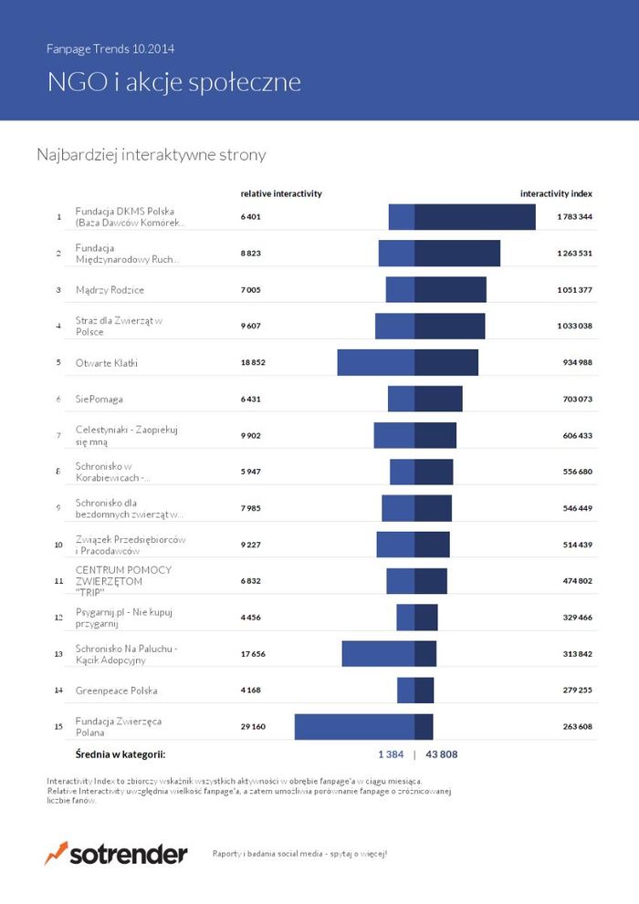 Dalej znalazły się Fundacja DKMS Polska (278 tys. fanów), a także Dawca.pl (246 tys. fanów). Ponad 20 tys. nowych fanów może się pochwalić WWF Polska (225 tys. fanów i blisko 24 tys. przyrost.) czy też Dawca.pl (27 tys. przyrost). DKMS i Dawca.pl znalazły się też wysoko w zestawieniu najbardziej angażujących profili.