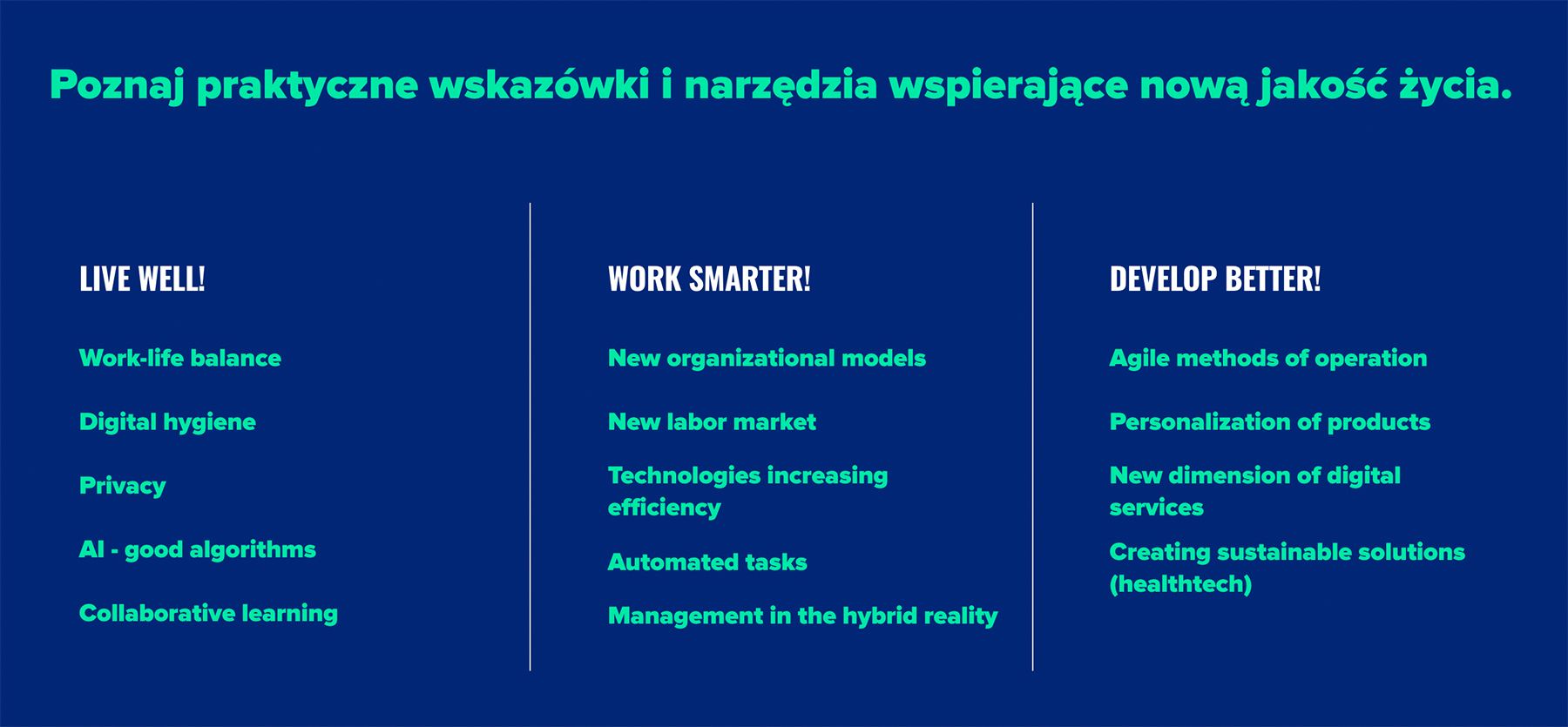 By zrozumieć te zmiany i przyjrzeć się im bliżej, jak co roku zaprosiliśmy, najlepszych ekspertów i ekspertki z całego świata, a nasze spotkanie zaprojektowaliśmy wokół trzech ścieżek tematycznych: Live well, Work smarter i Develop better.
