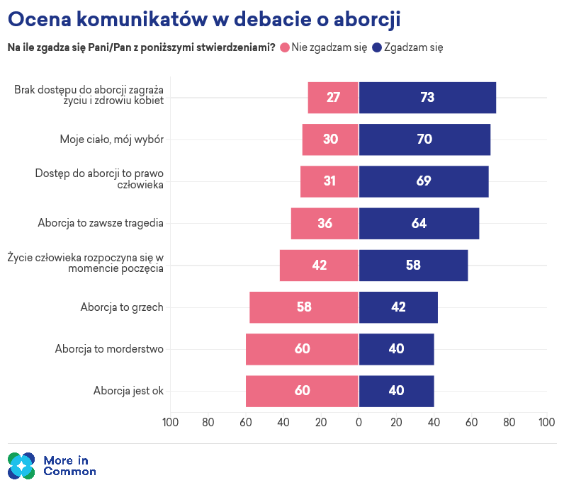 Myśląc o prawie do przerywania ciąży respondenci i respondentki odrzucają silnie oceniające uogólnienia. Zamiast tego dostrzegają wiele odcieni szarości i pozostawiają przestrzeń do indywidualnej oceny każdego przypadku i wyważenia różnych wartości. W centrum uwagi znajduje się dobrostan kobiety, jej bezpieczeństwo i zdrowie, w tym także psychiczne. 73% respondentów i respondentek zgadza się ze stwierdzeniem, że brak dostępu do aborcji zagraża życiu i zdrowiu kobiet. Niewiele mniej badanych deklaruje zgodę z hasłami „Moje ciało, mój wybór” (70%) oraz „Dostęp do aborcji to prawo człowieka” (69%). Najmniejszą popularnością wśród polskiego społeczeństwa cieszą się natomiast hasła „Aborcja jest OK” (40%) i „Aborcja to morderstwo” (39%).