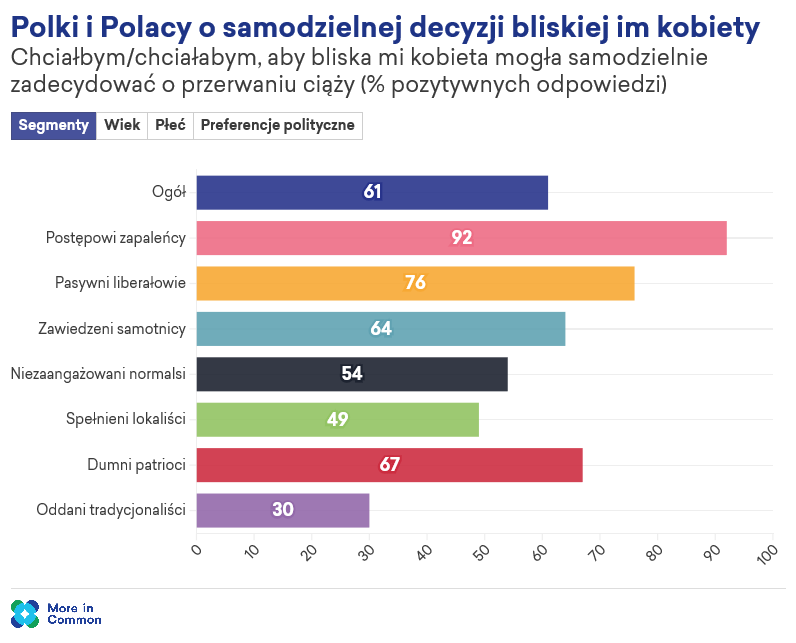 Przedstawicielki i przedstawiciele wszystkich segmentów krytykowali instrumentalizację tematu przerywania ciąży i wykorzystywanie go przez polityków do własnych celów, wyolbrzymiania różnic i, w konsekwencji, do dzielenia społeczeństwa. Sami badani stronili od skrajności, a do decyzji kobiety podchodzili z dużym zaufaniem. Aż 61% procent badanych przyznało, że chciałoby, aby bliska im kobieta mogła samodzielnie decydować o przerwaniu ciąży.