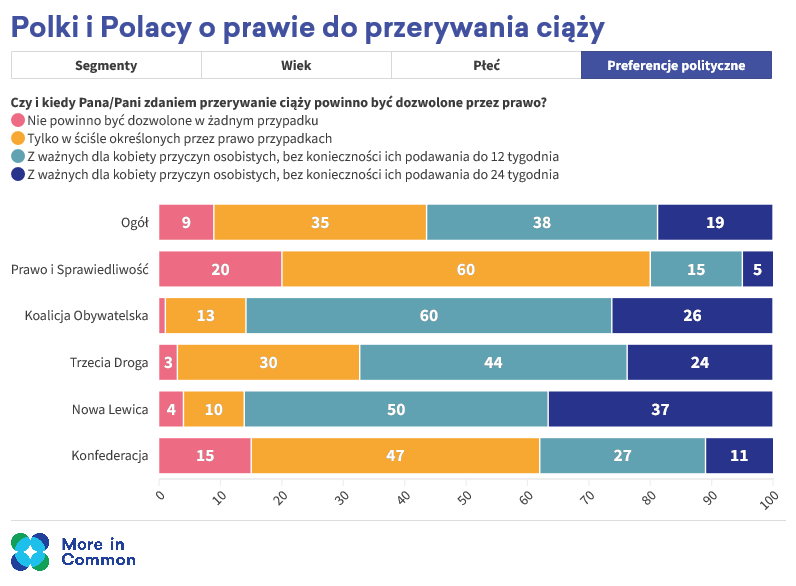 – Obserwując debatę publiczną, czy słuchając niektórych polityków, można odnieść wrażenie, że temat przerywania ciąży mocno antagonizuje polskie społeczeństwo – komentuje Zofia Włodarczyk, badaczka w More in Common Polska, współautorka raportu. – Wyniki naszych badań dowodzą jednak, że Polki i Polacy nie podchodzą do kwestii przerywania ciąży przez pryzmat politycznego czy ideologicznego sporu, ale traktują ją jako sprawę niezwykle osobistą i intymną. Jednocześnie, w zdecydowanej większości do decyzji kobiet odnoszą się z szacunkiem i zrozumieniem, niezależnie od własnych przekonań.