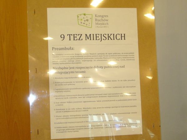 Bezpośrednim rezultatem Kongresu Ruchów Miejskich było opracowanie i zawieszenie na drzwiach urzędów miast „9 Tez Miejskich”. Był to indeks głównych problemów, z jakimi boryka się większość miast w Polsce.