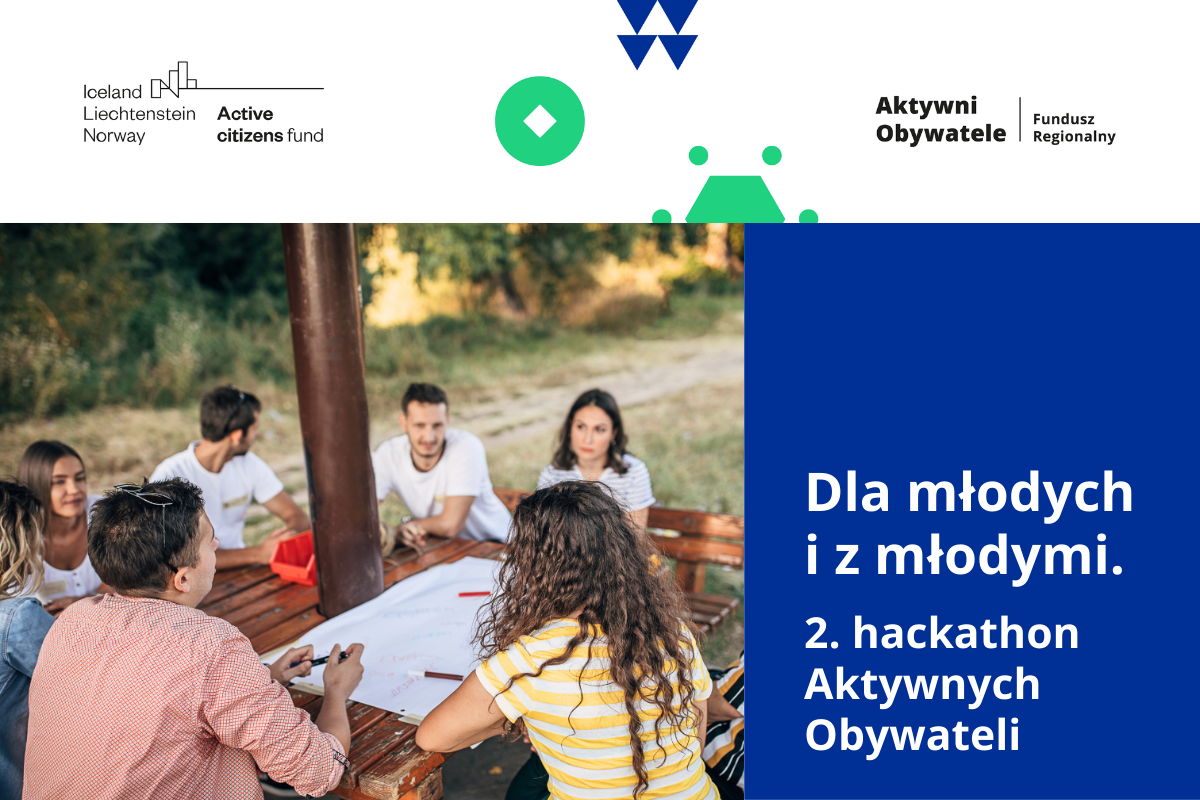 Zdjęcie kilku osób siedzących przy stoliku w plenerze. Na stole leży papier flipczartowy i markery. Obok tekst: Dla młodych i z młodymi. 2. hackathon Aktywnych Obywateli. W lewym górnym rogu logo Programu Aktywni Obywatele z tekstem: Iceland, Liechtenstein, Norway. Active Citizens Fund. W prawym górnym rogu znak Programu Aktywni Obywatele Fundusz Regionalny.