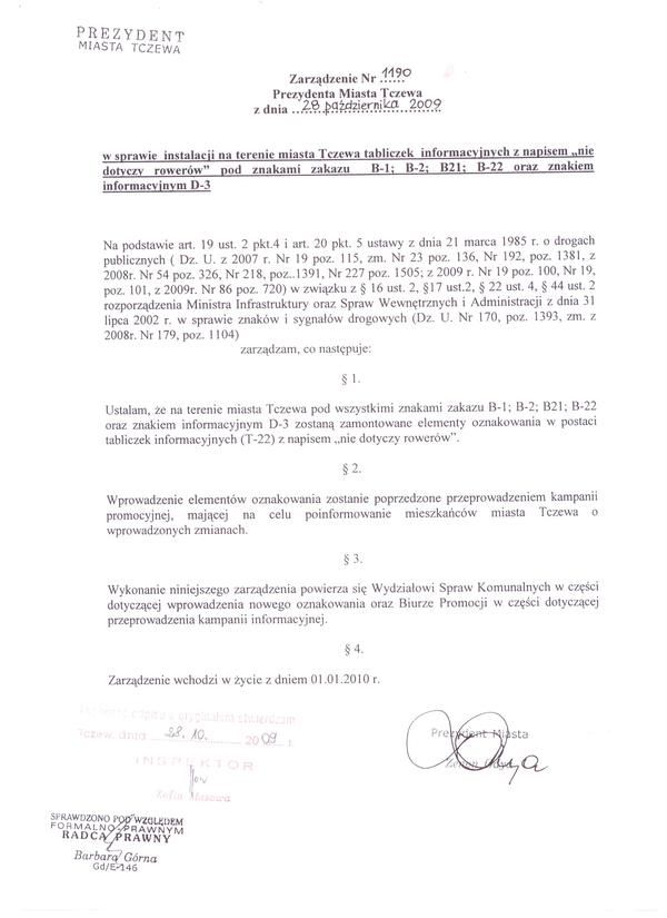 28 października Prezydent Miasta Tczew Zenon Odya podpisał zarządzenie dotyczące zamontowania tabliczek informacyjnych z napisem "nie dotyczy rowerów".