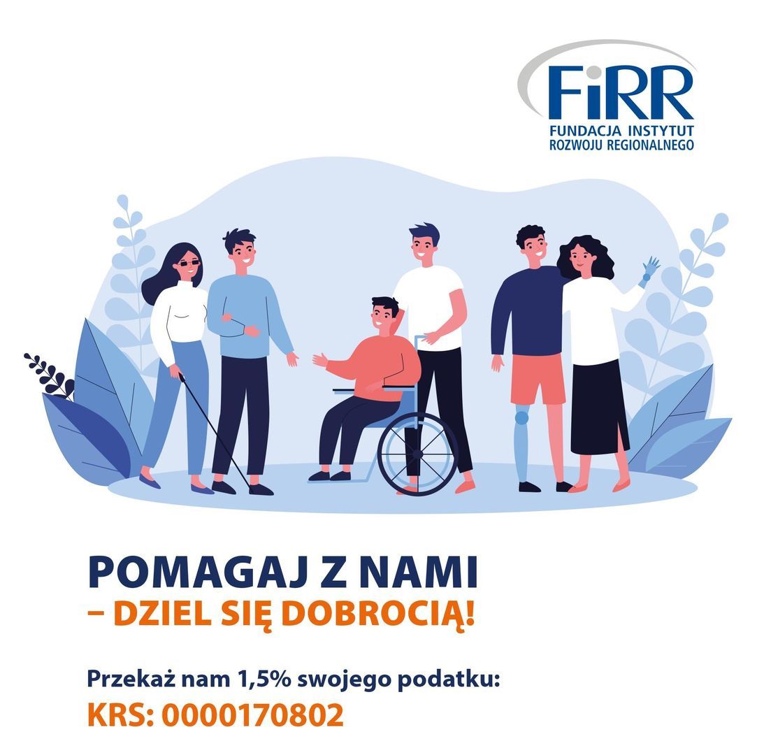 Przekazując 1,5 % Fundacji Instytut Rozwoju Regionalnego przyczyniasz się do tworzenia dostępnego i przyjaznego świata dla wszystkich, w tym dla osób ze szczególnymi potrzebami. Masz realny wpływ na to, jak wygląda otaczająca nas rzeczywistość i jak zmienia się świadomość społeczna.