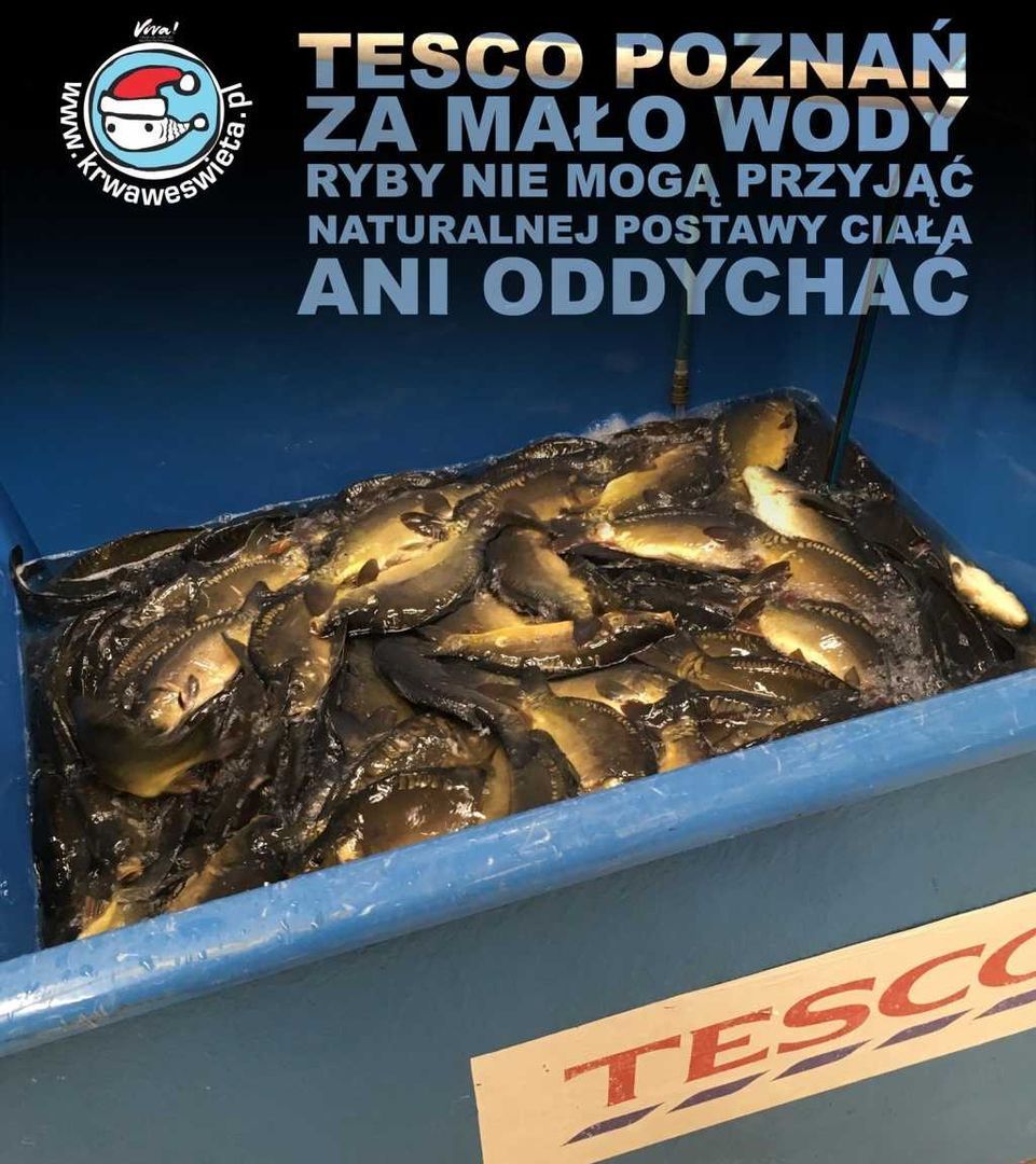– Na filmie z Tesco w Oławie widać natomiast żywe karpie w foliowych workach bez wody – mówi Anna Plaszczyk z Fundacji Viva! – Obok ryb w tych siatkach umieszczono kratki, które rzekomo mają umożliwiać rybom oddychanie przez skórę. Po pierwsze – żeby tak było karpie musiałyby być umieszczone w kratce, a nie obok niej. Po drugie – oddychanie ryb przez skórę to wymysł branży rybackiej na potrzeby sprzedaży żywych karpi bez wody – tłumaczy. (https://www.facebook.com/1541392822543349/videos/304818803702499/)