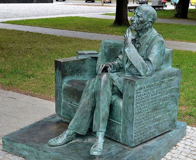 Ławeczka Jana Karskiego w Warszawie przed Muzeum POLIN (fot. Adrian Grycuk, źródło: https://commons.wikimedia.org/wiki/File:Jan_Karski_bench_in_Warsaw_05.JPG)
