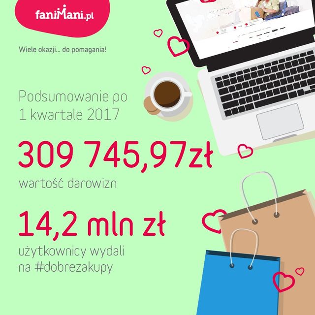 Przedstawiamy podsumowanie darowizn zebranych na FaniMani po pierwszym kwartale 2017 r. Wartość darowizn od zakupów wyniosła 309 745,97 zł. Użytkownicy wydali na #dobrezakupy łącznie 14,2 mln zł. Wśród zbierających jest już 2915 organizacji, które można wspierać podczas zakupów w 856 sklepach internetowych.