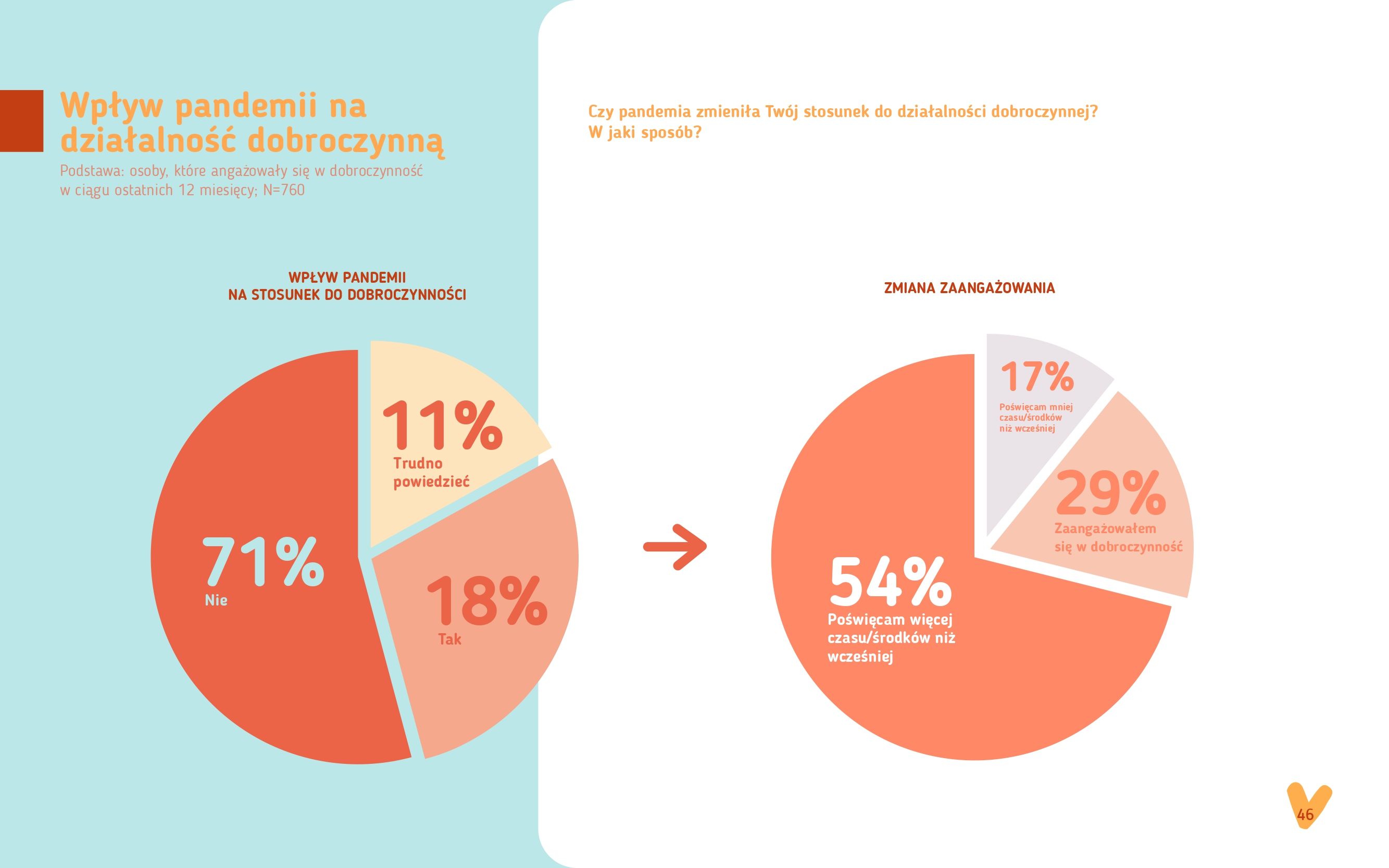 W raporcie przedstawiono wyniki z badania dotyczącego doświadczeń Polek i Polaków związanych z działalnością dobroczynną w początkowym okresie pandemii COVID-19 (Badanie przeprowadzono w czerwcu 2021, odpowiedzi respondentów obejmowały okres do 12 miesięcy wstecz). Celem było poznanie motywacji i barier dorosłych Polaków związanych z pomaganiem. Jak wyglądało ich zaangażowanie w działalność dobroczynną? Co motywuje ich do zaangażowania w taką działalność?