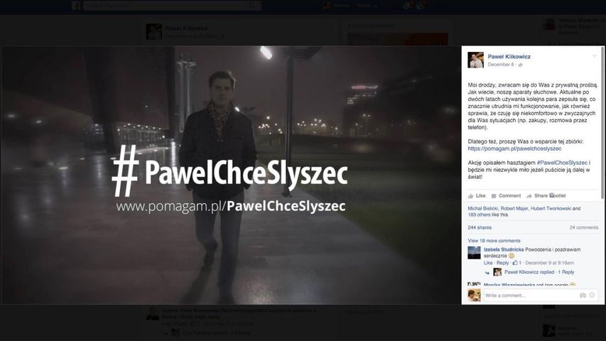 Finalnie do Klikowicza zgłosił się producent aparatów słuchowych, który przekaże mu specjalne, bezprzewodowe urządzenie do rozmów telefonicznych. Powodzenie akcji przerosło najśmielsze oczekiwania jego organizatora, dlatego po kupieniu potrzebnych aparatów, na które wyda 9000 zł, pozostałą kwotę przekaże innym potrzebującym. Dlatego też akcja, której core hashtagiem był #PawelChceSlyszec, w chwili osiągnięcia celu zmieniła go na #PawelBedzieSlyszec. Co więcej, Klikowicz wciąż zbiera pieniądze. Choć nie dla siebie. Wszystkie środki uzbierane ponad 9000 zł, zostaną przekazane na rzecz potrzebujących, a działaniu towarzyszy teraz hashtag #NiechUslyszaInni. - Gdy człowiek robi coś dobrego, to to wraca. Codzienna praca, wysiłek pokazuje, że to ma sens. Robiąc w życiu coś słusznego, ono wróciło. Masa ludzi, których znałem, a także tych, których jeszcze nie spotkałem spięła tę akcję w całość. Wiedziałem, że to się rozprzestrzeni, ale nie sądziłęm, że do tego stopnia - wyznaje Klikowicz. - Wszystkie te fundusze, które udało mi się zebrać są pewnym zobowiązaniem. I pewnego rodzaju motywacją. To kolejny krok tego typu, uświadomienie, że warto robić coś dobrego - kończy Klikowicz.