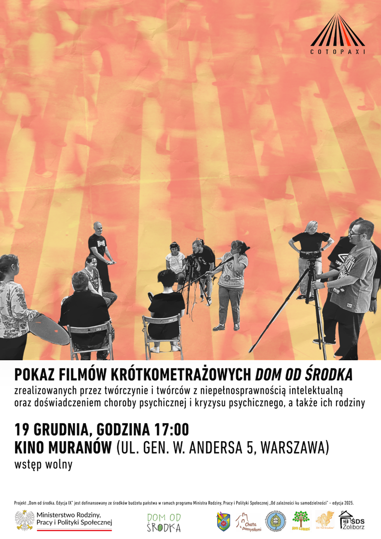 19 grudnia o godz. 17:00 w warszawskim Kinie Muranów odbędzie się finał IX edycji projektu „Dom od środka” – uroczysty pokaz filmów krótkometrażowych zrealizowanych przez osoby z niepełnosprawnością intelektualną oraz osoby z doświadczeniem choroby i kryzysu psychicznego, a także ich rodziny. Wstęp na wydarzenie jest wolny.