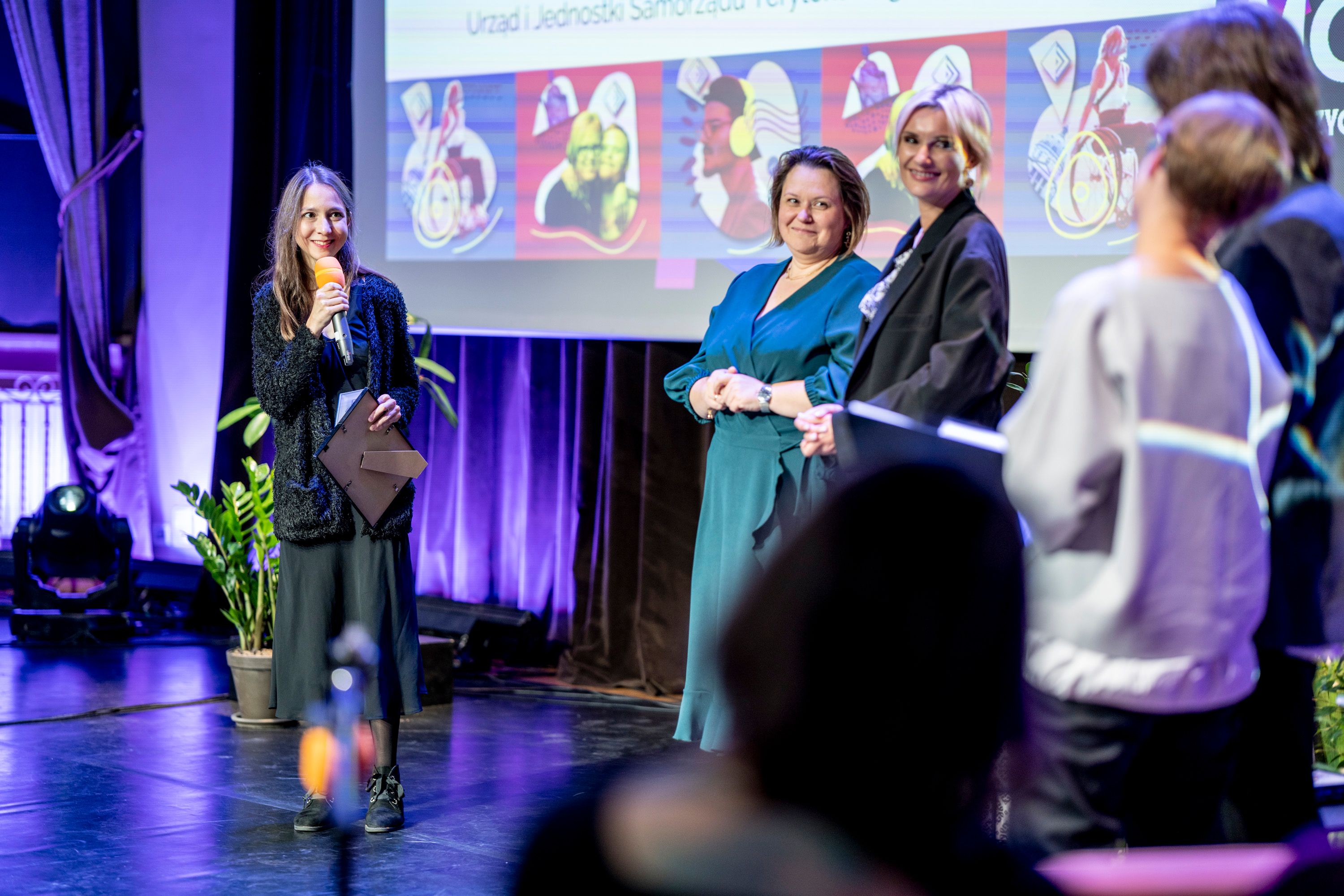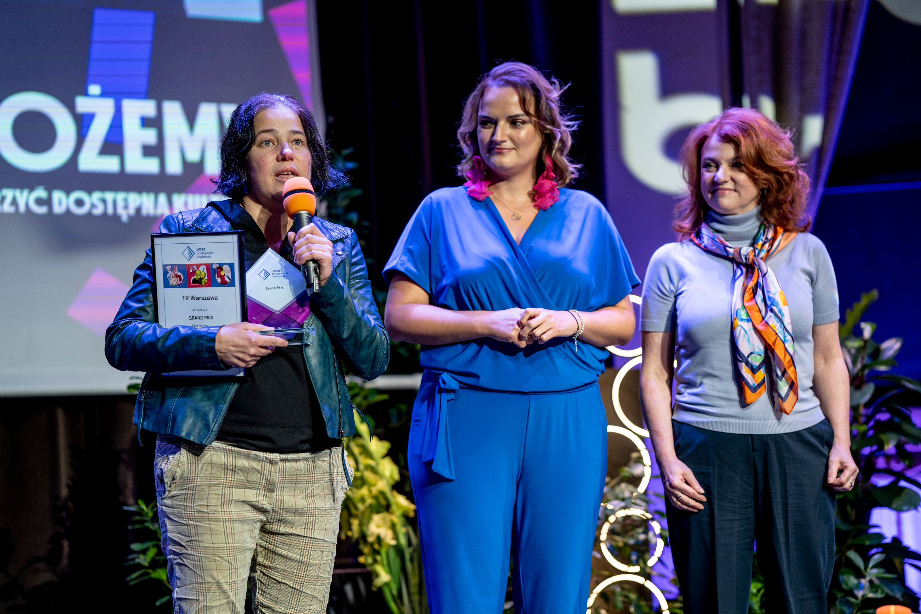 Marta Przasnek, koordynatorka Muzeum Sztuki Nowoczesnej w Warszawie, odbiera nagrodę Lidera Dostępności w imieniu muzeum. Obok Donata Kończyk, pełnomocniczka Prezydenta M.St. Warszawy do spraw dostępności, oraz Anna Lewandowska, członkini kapituły Plebiscytu.