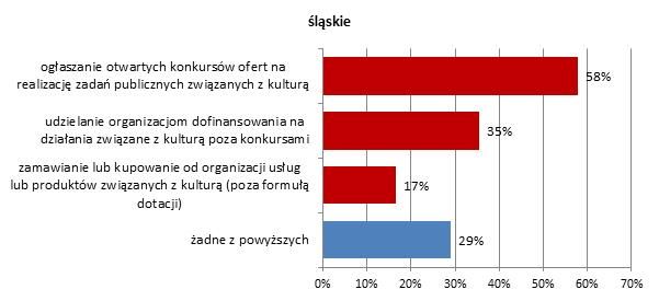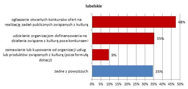 Najczęściej spotykaną formę współpracy finansowej pomiędzy jednostkami samorządu terytorialnego a organizacjami pozarządowymi zajmującymi się działalnością kulturalną stanowią otwarte konkursy ofert na realizację zadań publicznych. Wspomniana procedura jest nieco bardziej popularna na Śląsku, gdzie konkursy ogłasza 58% gmin, niż w regionie lubelskim, w którym na konkursy decyduje się nieco mniej niż połowa. Ogółem – w obu województwach około połowa urzędów zleca ostatecznie organizacjom zadania w obszarze kultury, przyznając im jednocześnie na ten cel dotację.