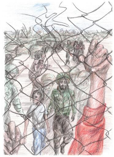 Rysunki wykonane przez lekarkę Lekarzy bez Granic, Ayla Emmink w obozie – ponieważ robienie zdjęć w obozie jest praktycznie zabronione, rysunki są formą graficznej dokumentacji obozowej rzeczywistości