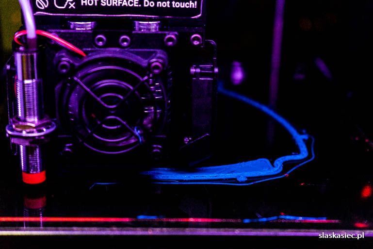 Czas wydruku znacząco wydłużał się, gdy nasza drukarka 3D miała problemy z przepustowością dyszy rozprowadzającej materiał. Ta dysza bardzo lubi się zatykać, a można ją odetkać za pomocą igły lub materiału do czyszczenia dysz lub, w najgorszym przypadku, rozebrania całej głowicy drukującej i jej ponownego złożenia. Na całe szczęście podczas wydruku przyłbic ochronnych przez Śląską Sieć 3 sektora dysza na poważnie zatkała się “tylko dwa razy” i jej odetkanie nie przysporzyło większych problemów.